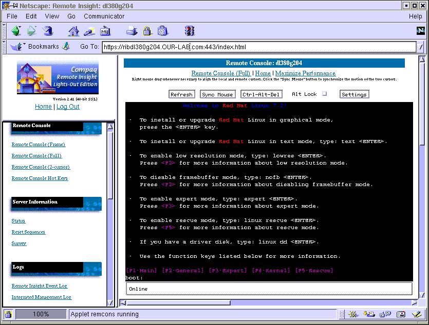 1. Connect to the Remote Insight Lights-Out card of the Linux system from a Java-enabled browser (Netscape, MSIE) using the URL https://XX.XX.XX.XX where the X's are the IP address assigned to the card. You can use a Linux system running Netscape or a Windows system running Netscape or Microsoft Internet Explorer. Just have the redhat-bootnet.img local to the system running the browser. Note that this special image file is larger than a regular 1.44MB floppy. Note: You may want to use FTP to move the file to the system that you will run the browser on.